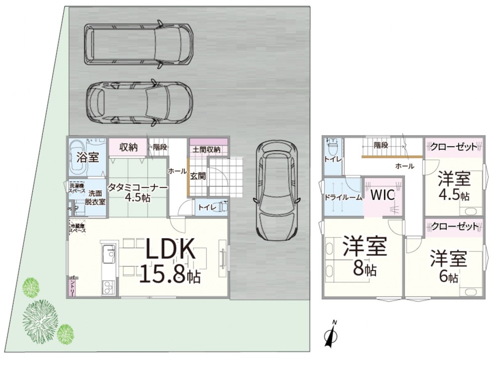 - 側溝、システムキッチン、カウンターキッチン、食器洗浄乾燥機、IHクッキングヒーター、オール電化、シャンプードレッサー、洗浄便座、浴室乾燥機、追い焚き、複層ガラス、ウォークインクローゼット、モニタ付インターホン、ペット可、1BOX駐車可、駐車場3台分、エコキュート、トイレ2箇所